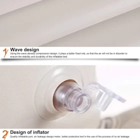 تتميز بتصميم خفيف الوزن وقابل للطي، وتُنفخ خلال دقيقتين فقط باستخدام مضخة الهواء المرفقة التي تعمل عبر ولاعة السيارة. كما أن سطحها المصنوع من النسيج المُبطن عالي الكثافة يقلل من الضوضاء ويوفر راحة فائقة أثناء النوم.
