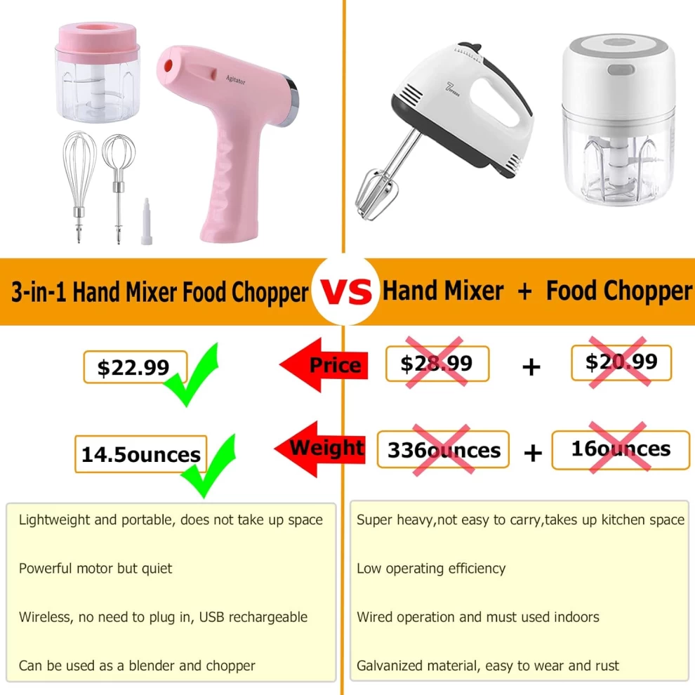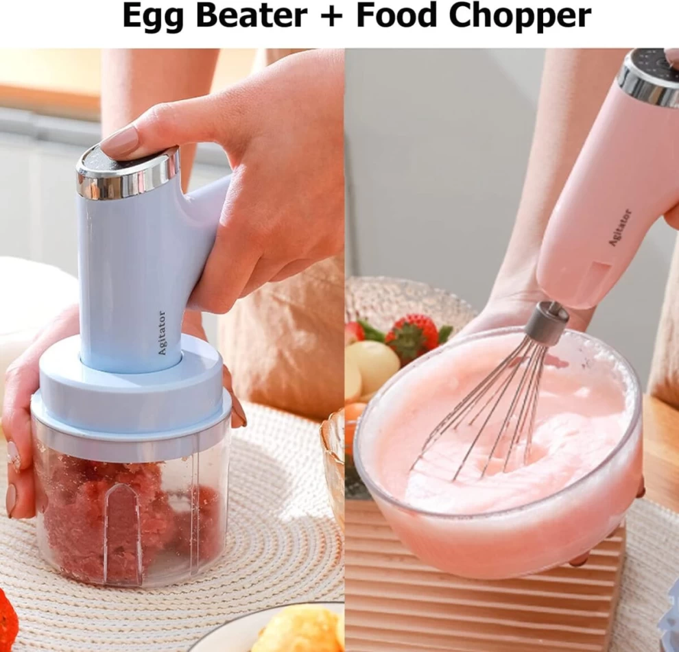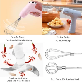 اجعل الطهي اليومي أسهل وأسرع مع الخلاط اليدوي الكهربائي الصغير 3 في 1. جهاز قوي، لاسلكي، وقابل للشحن عبر USB يعمل كـ مفرمة طعام صغيرة، مضرب بيض، وصانع طعام للأطفال. مزود بـ 5 سرعات قابلة للتعديل وملحقات من الستانلس ستيل، وهو مثالي لـ الطهي المنزلي، الخَبز، وتحضير طعام الأطفال بتصميم أنيق باللون الوردي.