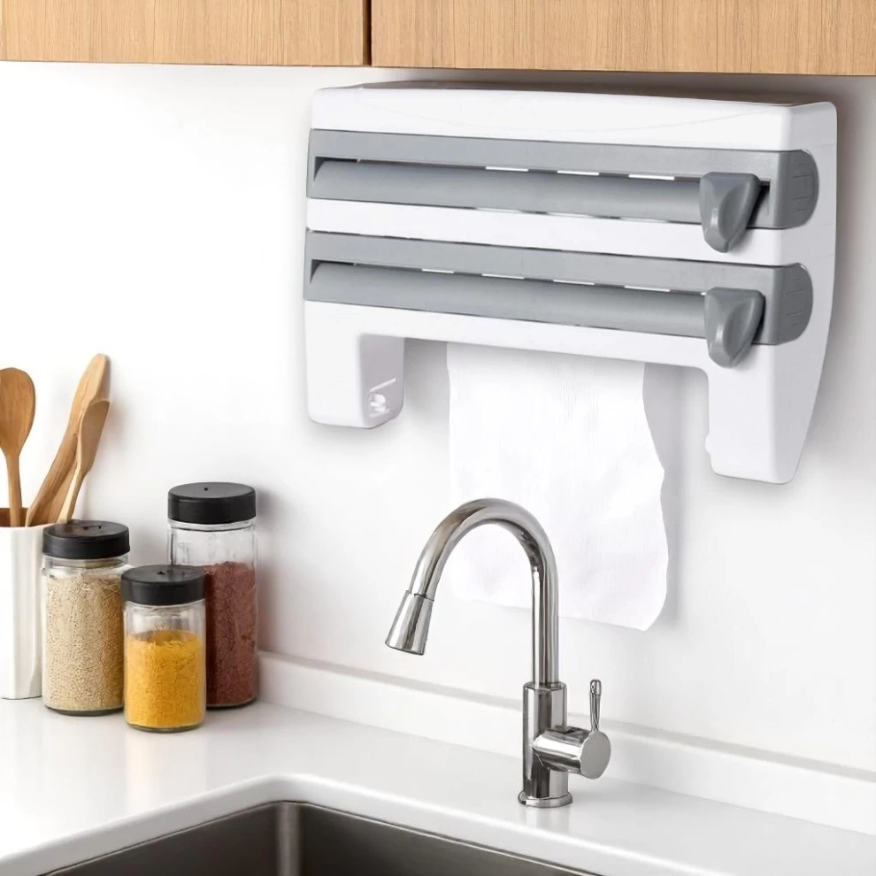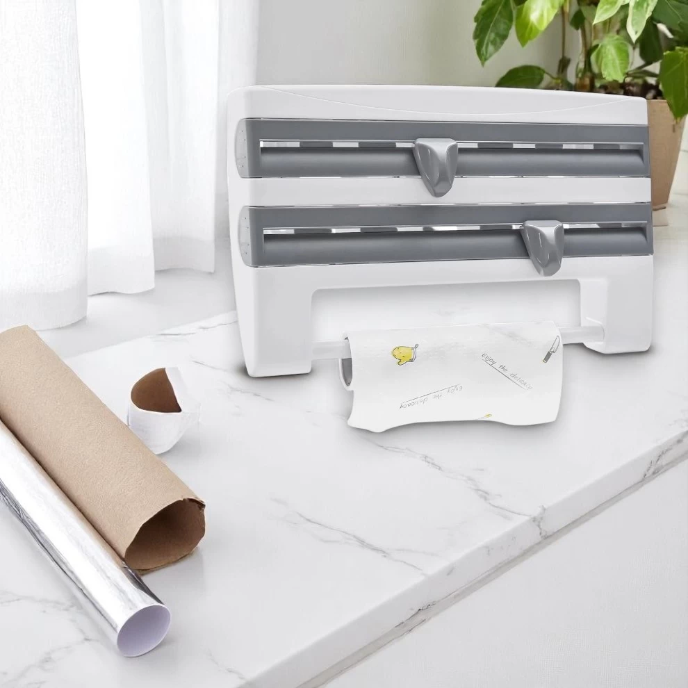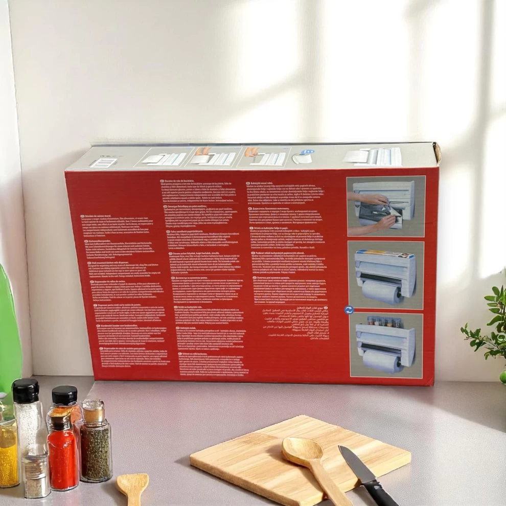 • 🧻 3 في 1 – موزع للمناديل الورقية، ورق الألمنيوم، ونايلون التغليف