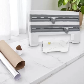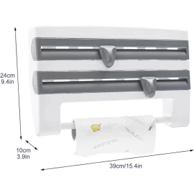 خلّي مطبخك أكثر ترتيبًا وذكاءً مع موزع المناديل الثلاثي! يوفر لك هذا الموزع العملي مكانًا واحدًا لتنظيم ورق الألمنيوم، النايلون اللاصق، والمناشف الورقية، مما يوفر المساحة والوقت. تصميمه الجداري يساعد على التخلص من الفوضى ويجعل كل شيء في متناول يدك. شكله الأنيق باللون الأبيض والرمادي يضيف لمسة عصرية لأي مطبخ.