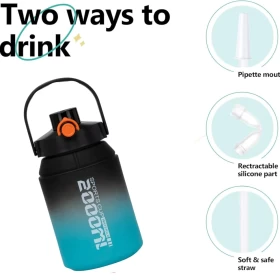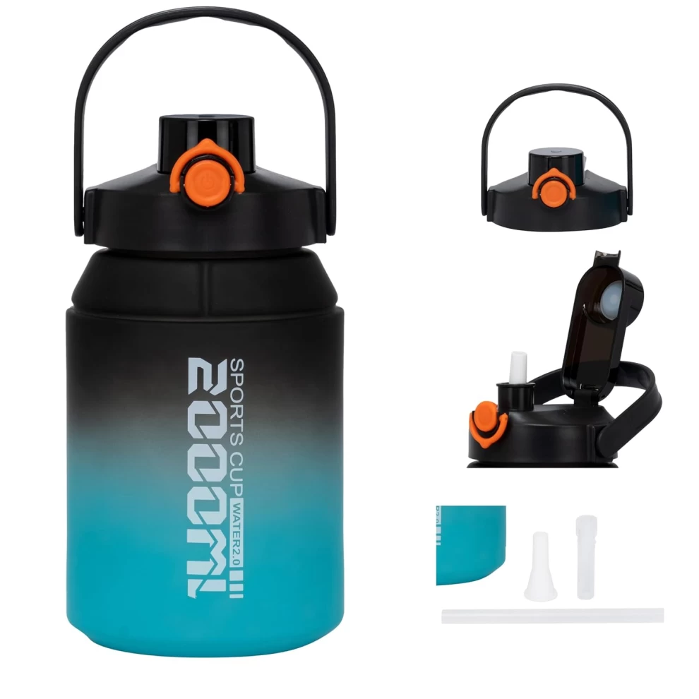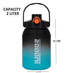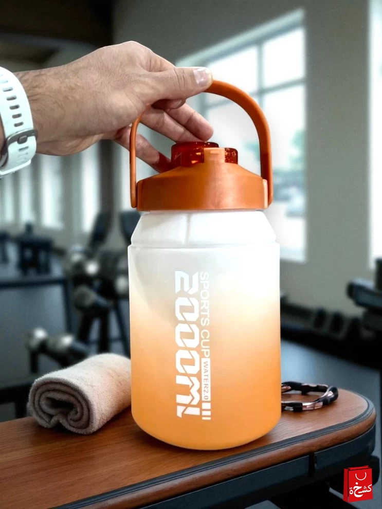 قارورة الماء بسعة 2 لتر صُممت لتناسب التمارين الرياضية، السفر، والاستخدام اليومي. تتميز بغطاء مزدوج (يمكن استخدام أحدهما ككوب)، شلمون مرن وقابل للإزالة، مقبض قوي للحمل، ومؤشرات وقت لتحفيزك على شرب المزيد من الماء. مصنوعة من بلاستيك صحي خالٍ من الـBPA لتمنحك استخدامًا آمنًا وطويل الأمد.