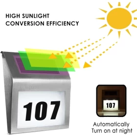 سهّل على الزوار وسائقي التوصيل العثور على منزلك بسهولة خلال الليل باستخدام لوحة أرقام المنازل المضيئة بالطاقة الشمسية والمضادة للماء. تصميمها العصري من الفولاذ المقاوم للصدأ، مع إضاءة LED تلقائية، يجعلها مثالية للأبواب، البوابات، والجدران – بدون أي أسلاك أو كهرباء مطلوبة!