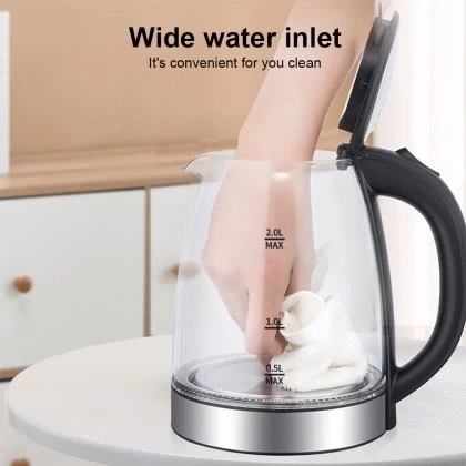 • تتميز غلايتنا الكهربائية بسعة سخية تبلغ 2 لتر، مما يوفر مساحة كبيرة لغلي الماء لحصص متعددة من المشروبات الساخنة المفضلة لديك أو الإبداعات الطهوية في المرة الواحدة.