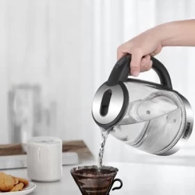 • مصنوعة من زجاج أنيق ومتين، لا تقدم غلايتنا الكهربائية إضافة أنيقة لمطبخك فحسب، بل توفر أيضًا رؤية واضحة لعملية الغليان، مما يضمن الأناقة والعملية في جهاز واحد.