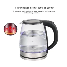 • استمتع بالأداء القوي مع غلايتنا الكهربائية، التي تتميز بنطاق طاقة قوي من 1500 واط إلى 2000 واط، مما يضمن الغليان السريع للمشروبات الساخنة المفضلة لديك والإبداعات الطهوية.