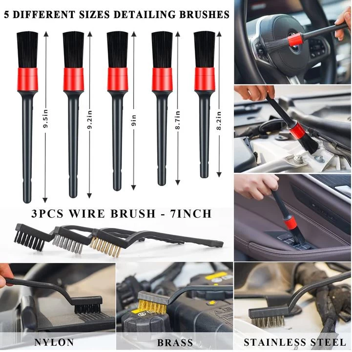 فُرَش تفصيلية وفرش معدنية – 5 فُرَش ناعمة للتفاصيل لتنظيف الفتحات والزوايا الصغيرة، و3 فُرَش معدنية (فولاذ، نحاس، نايلون) لإزالة الصدأ والأوساخ الصعبة.
