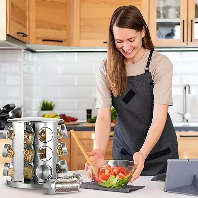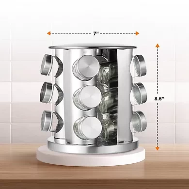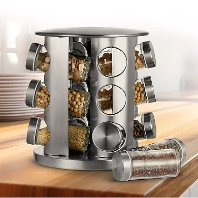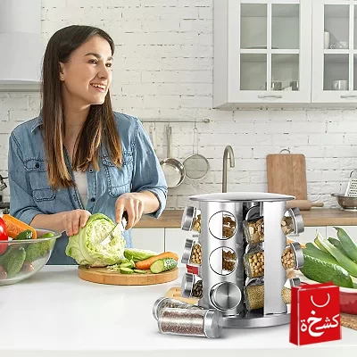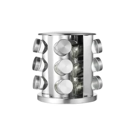 نظّم بهاراتك بكل أناقة وسهولة مع هذا الرف الدوّار المصنوع من الستانلس ستيل. يضم 12 عبوة زجاجية قابلة لإعادة التعبئة، مع قاعدة تدور 360 درجة لسهولة الوصول إلى جميع التوابل.