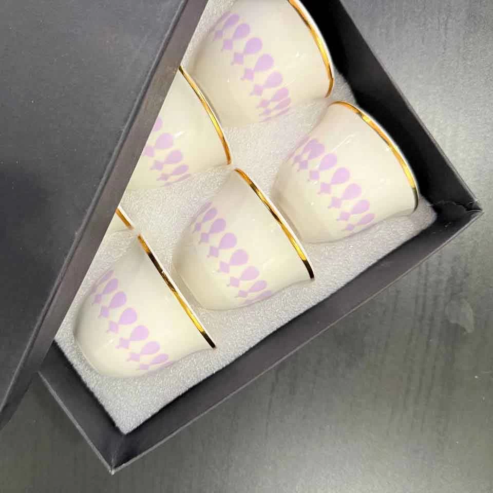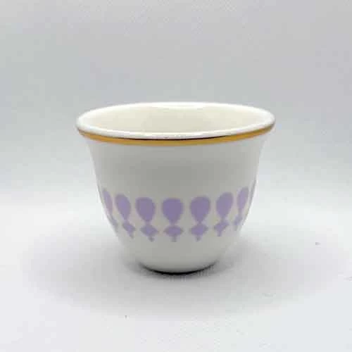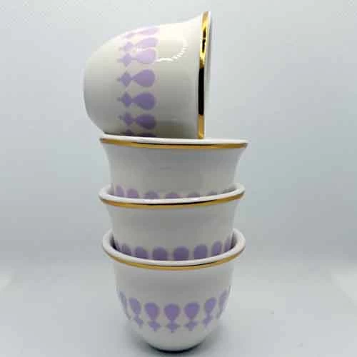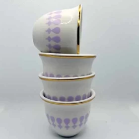 مصنوع من الخزف عالي الجودة بتصميم يجمع بين الأصالة والفخامة، مع حافة ذهبية ولمسات بنفسجية أنيقة تضيف جمالاً راقياً إلى طاولة القهوة.