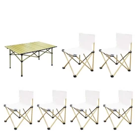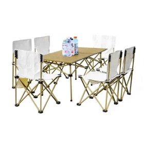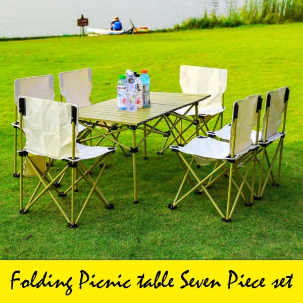 استمتع بوجباتك في الهواء الطلق مع طقم طاولة النزهة القابل للطي 7 قطع، مثالي للتخييم، النزهات، حفلات الحدائق، والخروج مع العائلة. تصميمه القابل للطي يسهل حمله وتخزينه، ويحتوي الطقم على طاولة وستة كراسي للراحة والعملية.