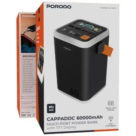 ابقَ مشحونًا في أي وقت مع Porodo Cappadoc بسعة 60000 مللي أمبير، المصمم للرحلات الطويلة والاستخدام المكثف. يتميز بمنافذ شحن متعددة وشاشة TFT لعرض نسبة البطارية وحالة الشحن بدقة.