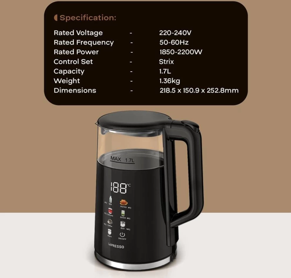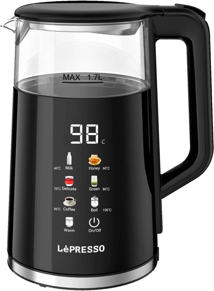 اغلي الماء بدقة وأناقة مع غلاية LePresso الكهربائية مع شاشة عرض درجة الحرارة متعددة المستويات. تتميز بـ نافذة شفافة وشاشة رقمية لعرض الحرارة، مما يجعلها مثالية لـ عشاق الشاي والقهوة والمطابخ الحديثة. مناسبة للاستخدام في المنزل والمكتب وتحضير المشروبات الاحترافية.