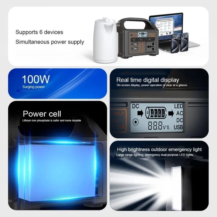ابقَ مشحونًا في أي مكان مع محطة الطاقة المحمولة 100 واط، الحل المثالي للطاقة الاحتياطية في الرحلات، التخييم، السفر، والطوارئ. مصممة لتشغيل الهواتف، اللابتوبات، الأجهزة الصغيرة، والإضاءة بسهولة وأمان.