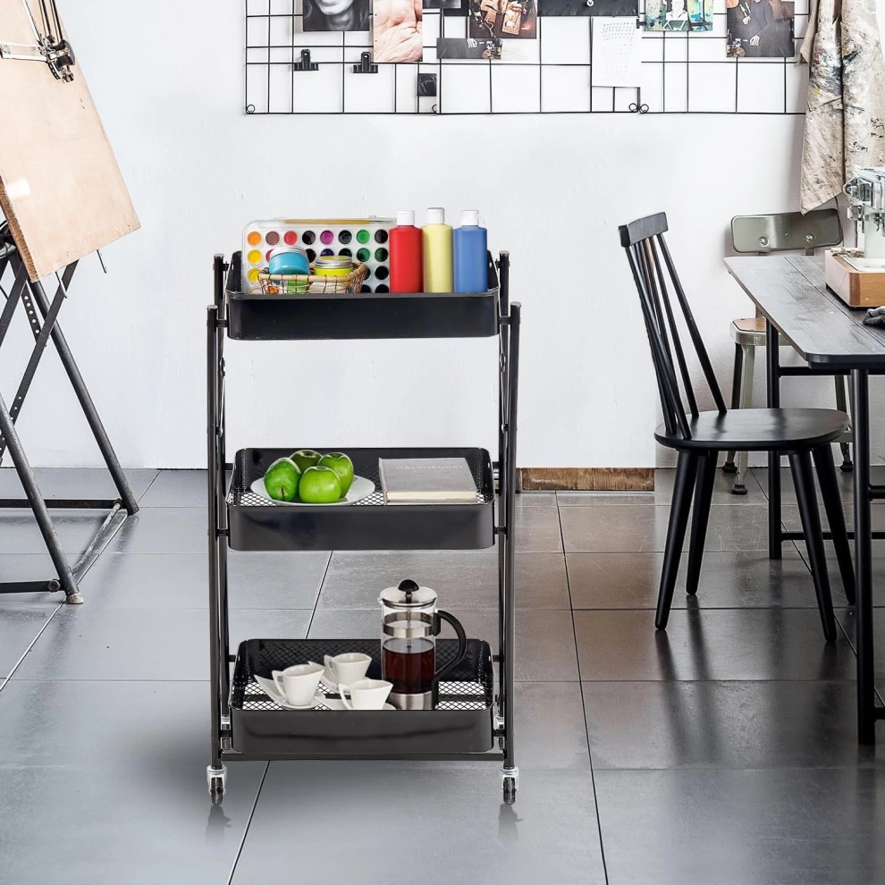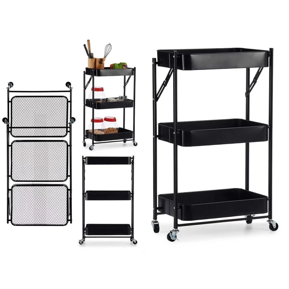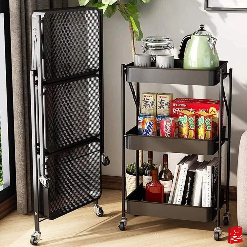 تتميز بتصميم قابل للطي، عجلات دوارة، وهيكل معدني قوي — مناسبة للمنازل، المكاتب، والمطابخ.