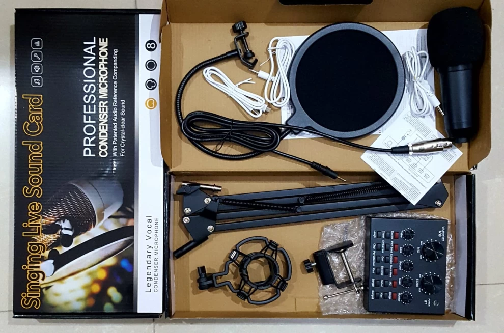 ✅ All-Inclusive Kit – Includes a studio condenser microphone, adjustable boom arm, pop filter, mic cover, and professional sound mixer