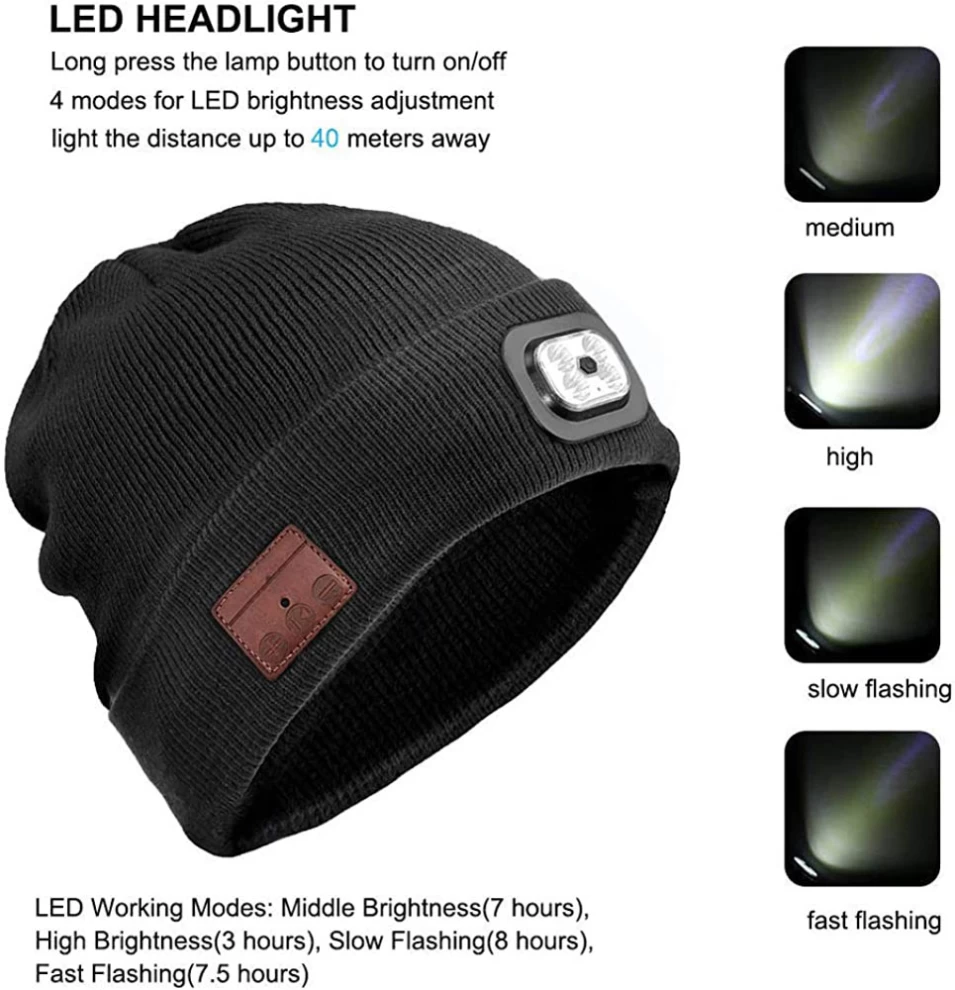 This Hi-Tech beanie , soft and gives great breathability, keep warm in cold days. The musical beanie with headlight is suitable for those who frequently take part in outdoor activities, such as running, fishing, dog walking, grilling, farming, hunting, camping, riding, hiking and so much more.
