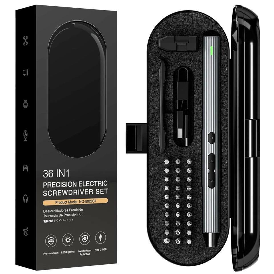 A versatile and powerful electric screwdriver kit with 36 different bits to handle all your screwing needs. Rechargeable and portable, perfect for home, office, and DIY repairs.