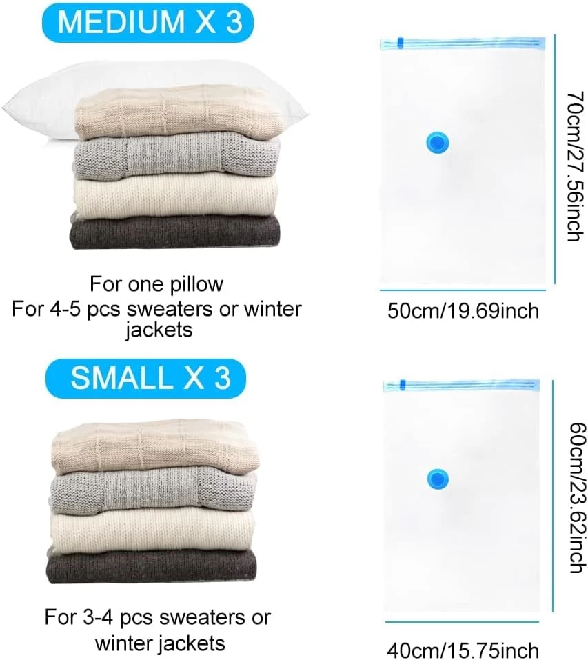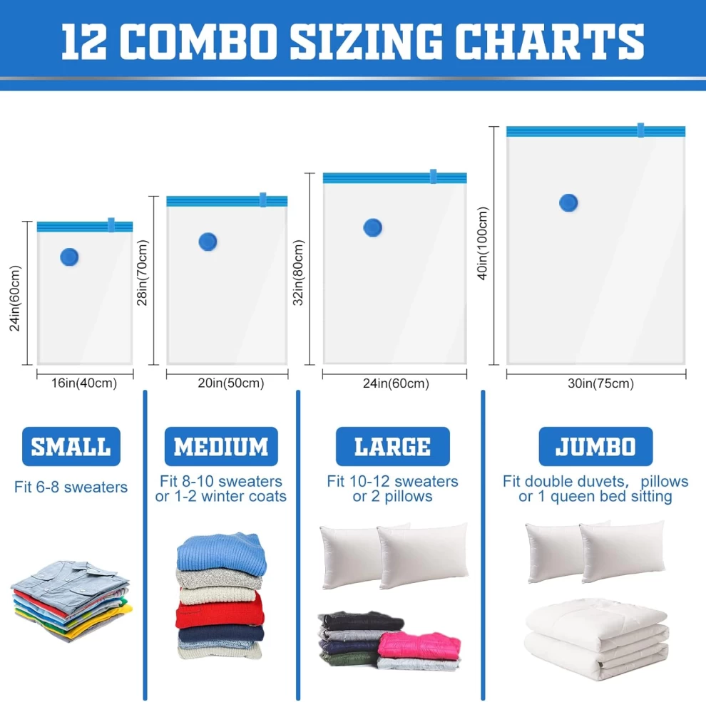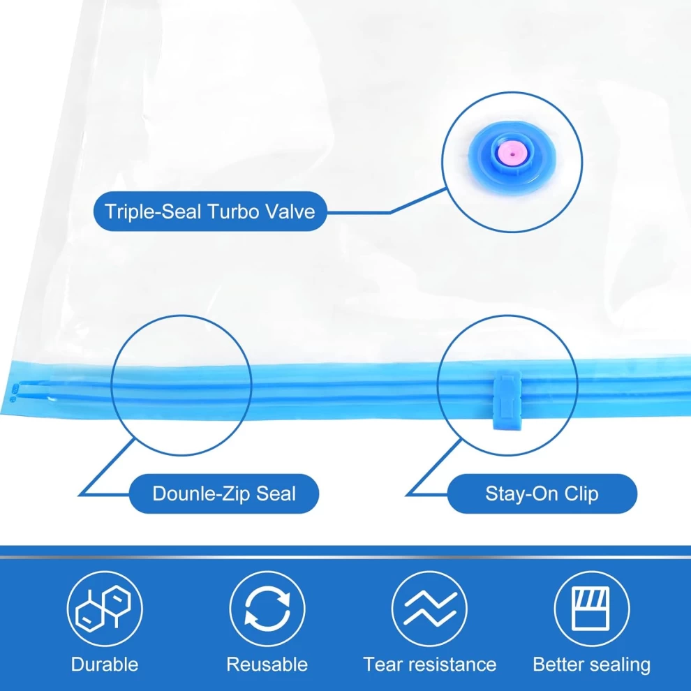 Equipped with double zipper seals, a stay-on clip, and a triple-seal turbo valve, these bags ensure powerful air-tight suction that keeps your items compact and protected from dust, moisture, and odors.