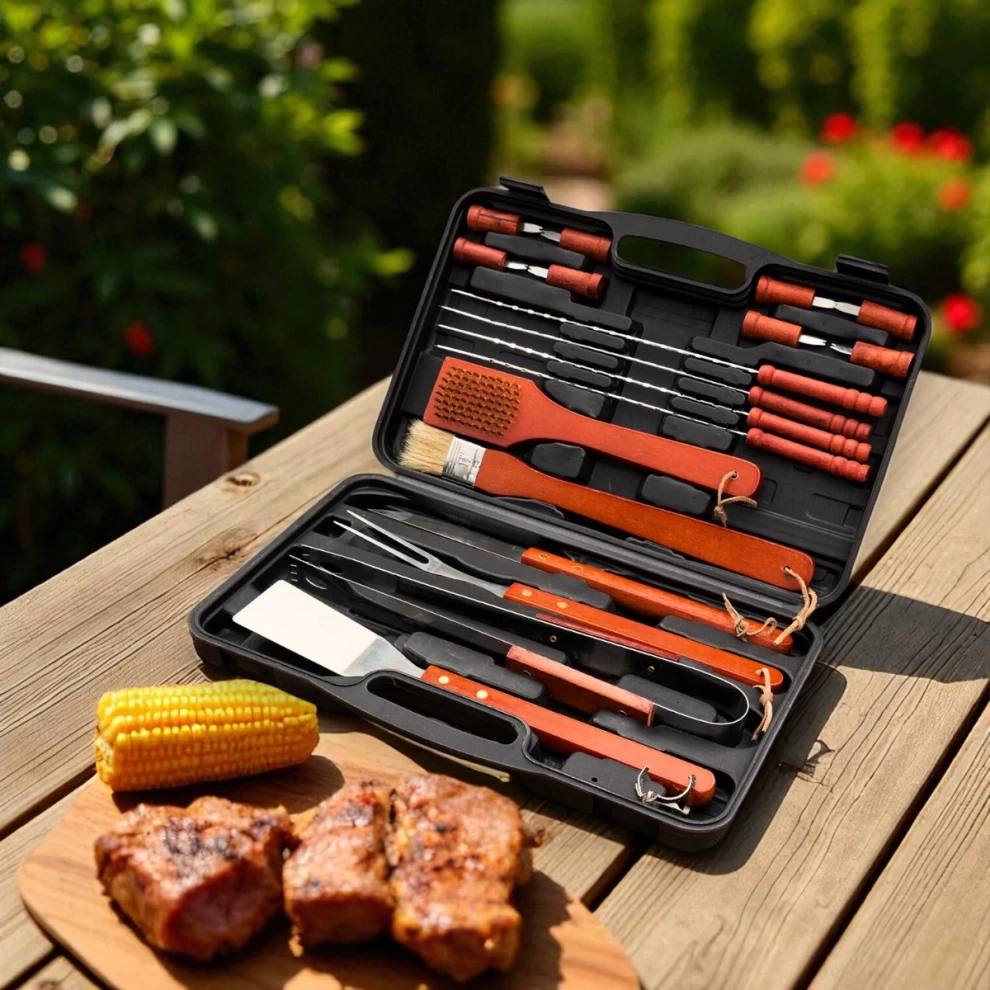 • 🍴 18 Essential BBQ Tools – Includes spatula, tongs, skewers & more