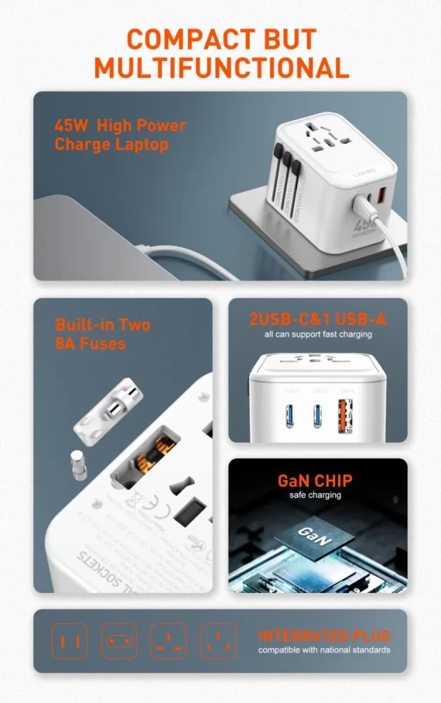 • Integrated US/UK/EU/AU sockets and plugs