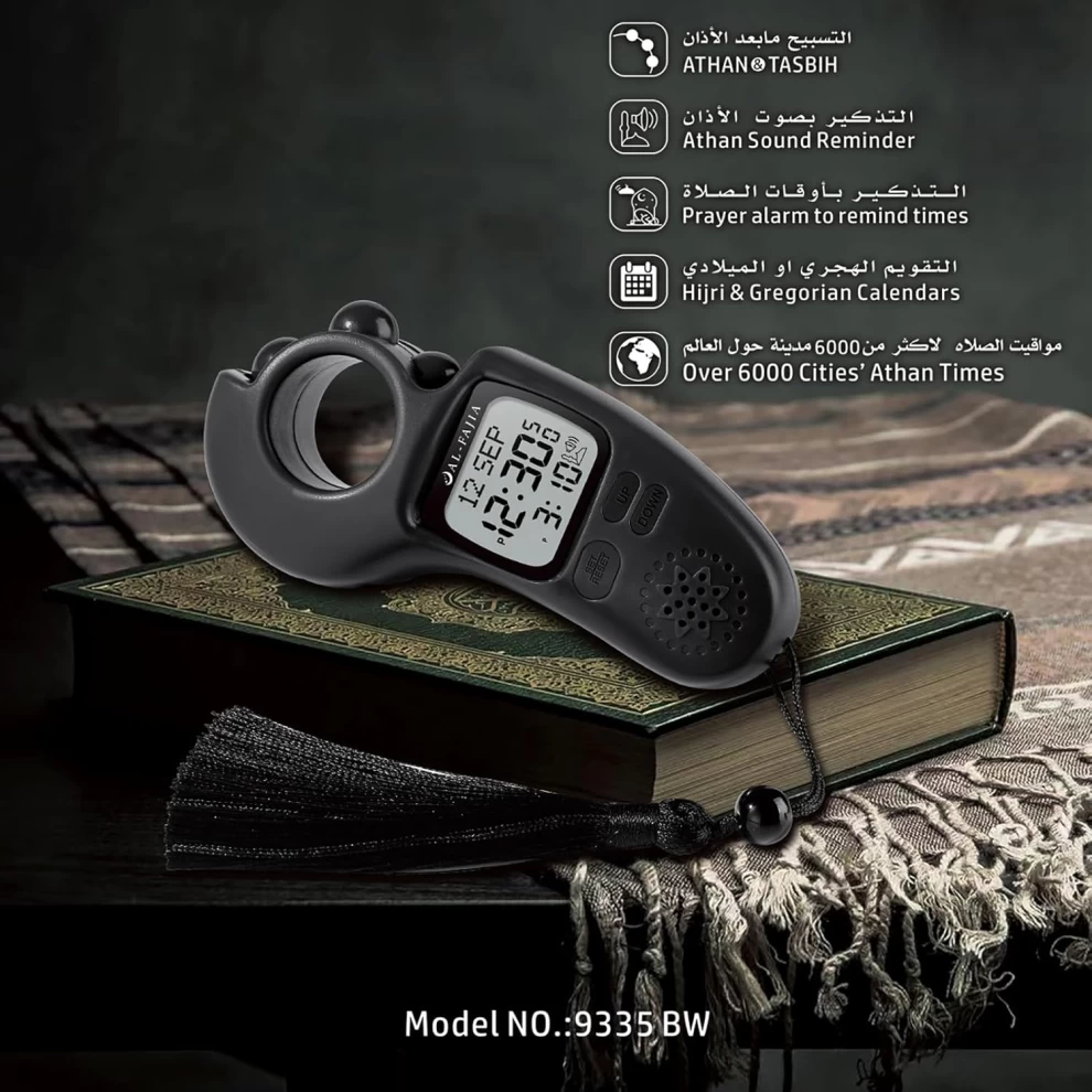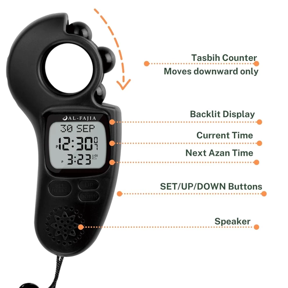Bring mindfulness, remembrance, and precision into your daily worship with this all-in-one portable Islamic prayer device. Designed for Muslims around the world, this compact unit includes global Azan times, a gentle Adhan sound, and a rotating digital Tasbih counter for easy dhikr anywhere, anytime.