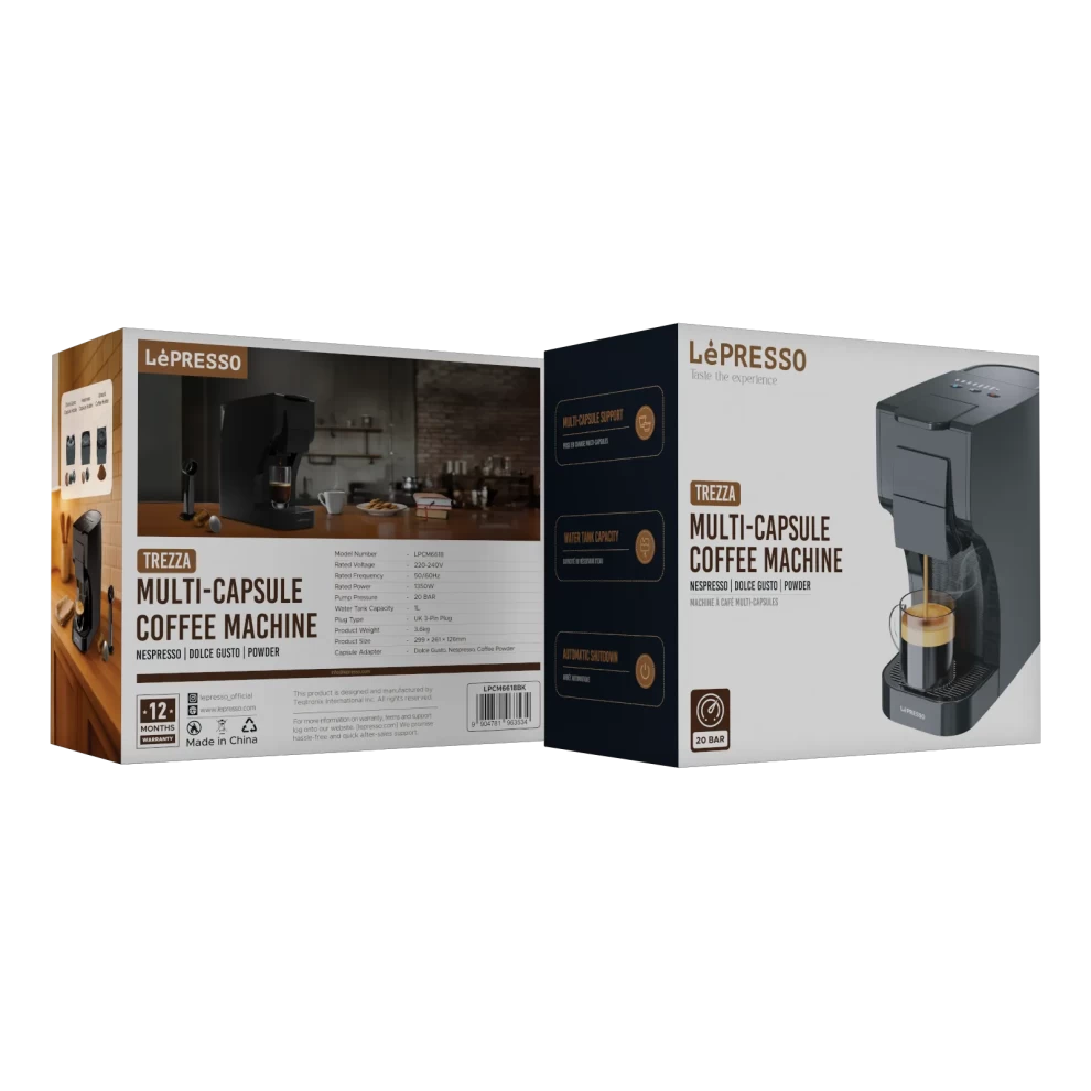 Enjoy the ultimate coffee experience at home or office with the LePresso Multi-Capsule Coffee Machine. Designed to brew espresso, lungo, or your favorite coffee using Nespresso® capsules, ground coffee, or pods, this versatile machine combines convenience, style, and barista-quality results. Perfect for coffee lovers seeking variety and efficiency.