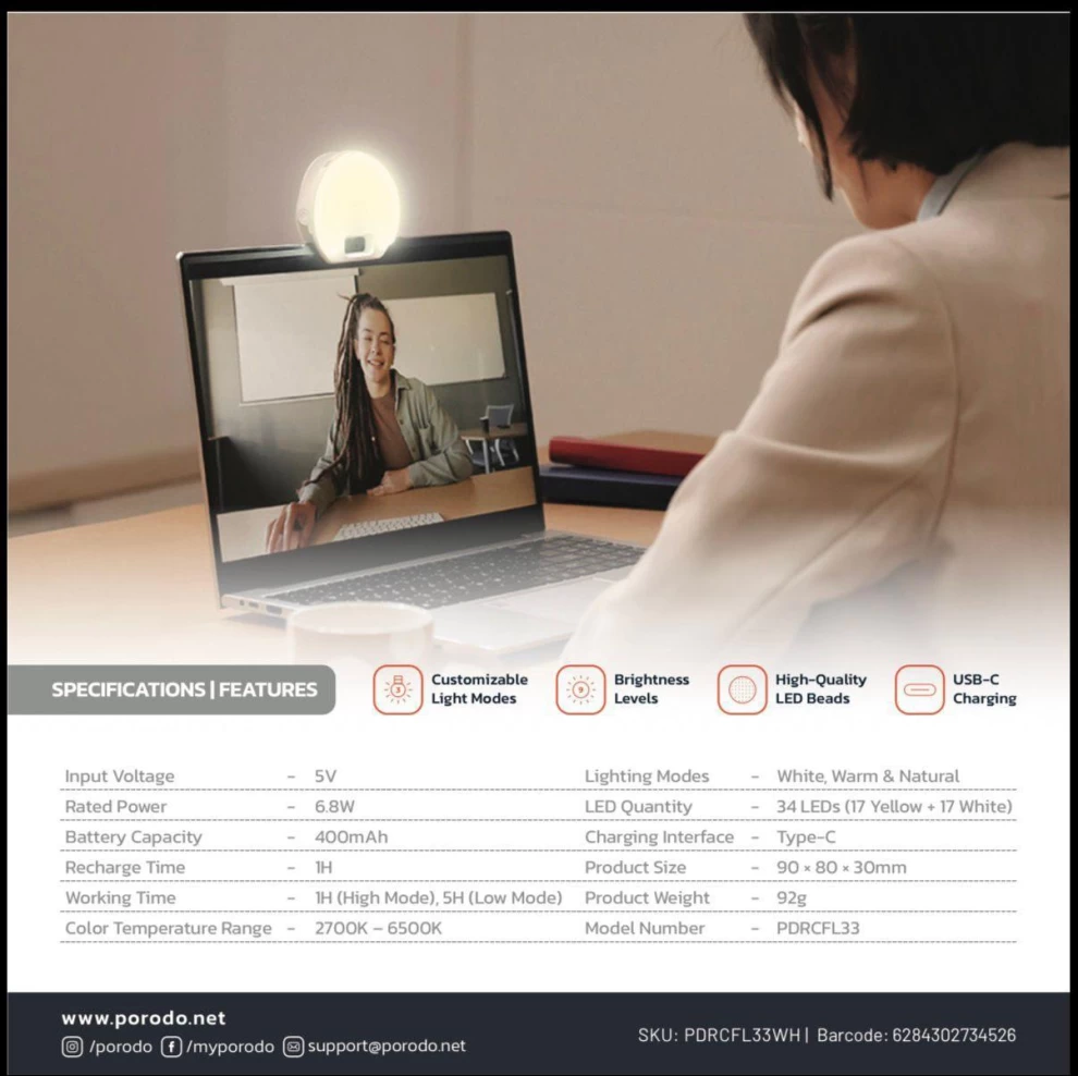 Enhance your photos, videos, and video calls with the Porodo GlowRing Portable Fill Light. Featuring a convenient clip-on design and adjustable brightness levels, this compact light delivers soft, even illumination—perfect for content creators, selfies, online meetings, and live streaming.