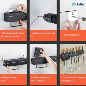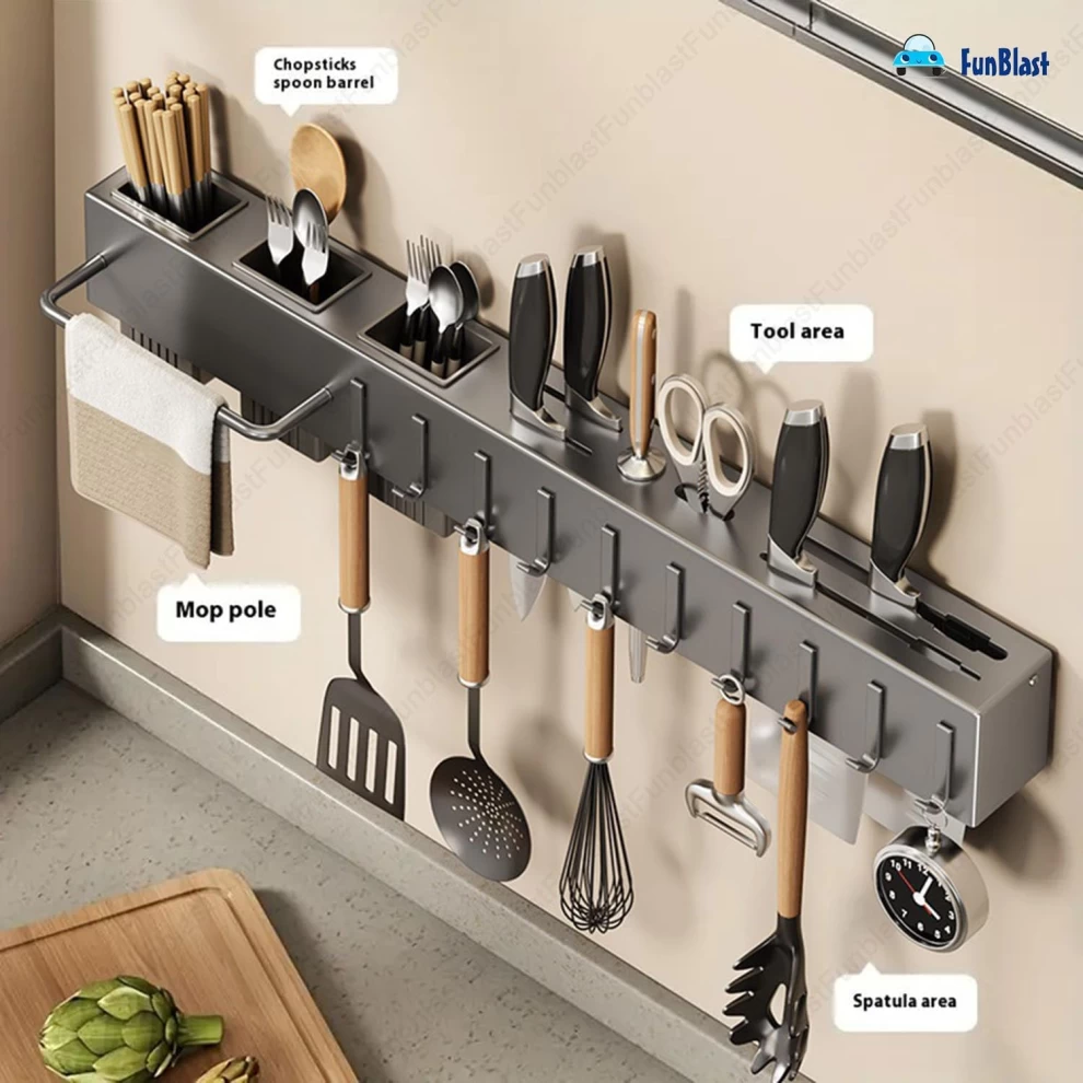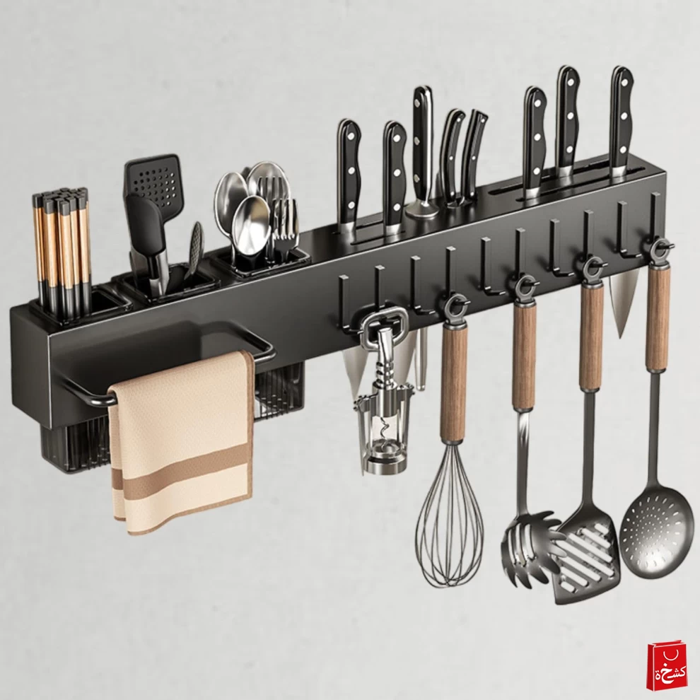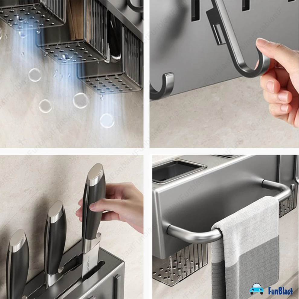 Featuring hanging hooks, a towel bar, cutlery holder, and floating shelf design, this multi-functional rack helps you declutter countertops while adding a modern touch to your kitchen.