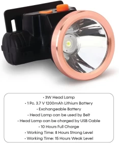 Impex 3w head lamp 1200 mah lithium battery exchangeable battery head lamp can be used by belt head lamp can be charged by USB cable, It takes 10 hours to full charge and its working time is 8 hours in strong level and 15 hours in weak level.