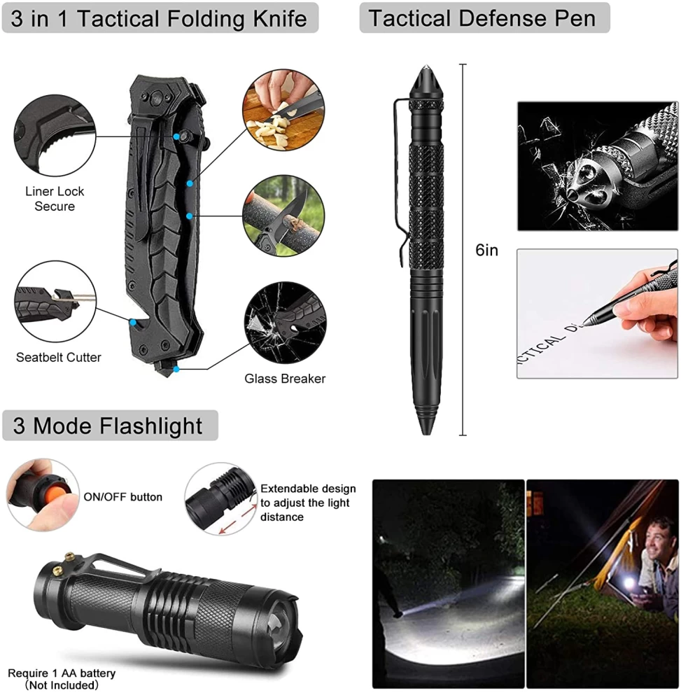 🔥 Essential Outdoor Tools – Includes fire starter, knife, and more