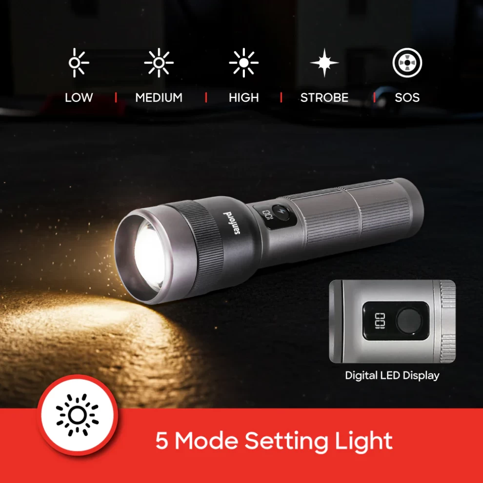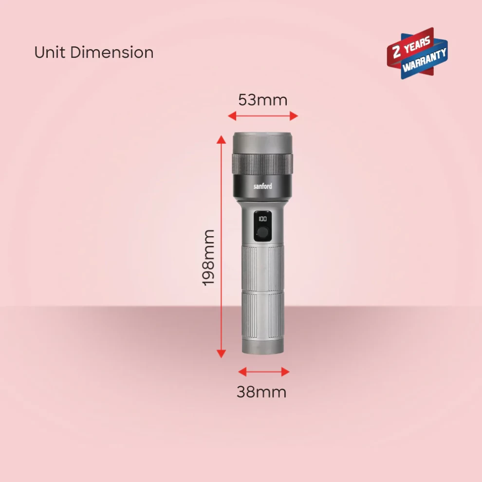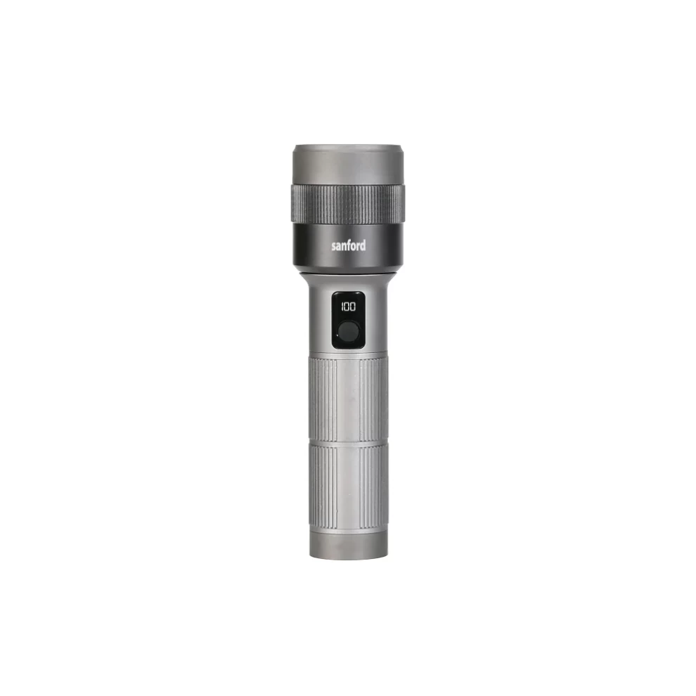 Experience powerful illumination with the Sanford SF6194SL Rechargeable Flashlight, engineered with a 50W laser LED for intense brightness and даль-range visibility. Featuring zoom functionality, 5 lighting modes, and a digital battery display, this flashlight is ideal for outdoor adventures, security, and emergency use. Built tough and designed for convenience, it delivers reliable performance anytime, anywhere.