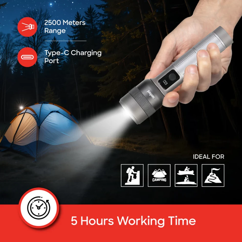 Power through darkness with the Sanford SF6198SL Rechargeable Flashlight, built with a 40W laser LED for strong, focused illumination. Featuring zoomable beam control, 5 lighting modes, and a digital battery display, this flashlight is perfect for camping, security, maintenance work, and emergencies. Compact, durable, and reliable—your everyday lighting essential.